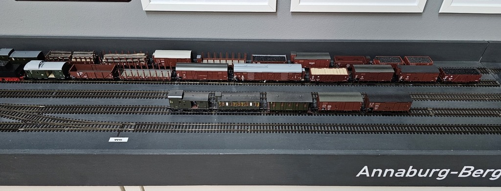Der doch ganz beachtliche Zug ist somit an allein zwei Bahnhöfen komplett zerlegt worden. Dabei sind noch nicht einmal alle vorhandenen Ladestellen der beiden Bahnhöfe bedient worden. Nimmt man an, dass auf weiteren gedachten Unterwegsbahnhöfen Wagen ausgestellt worden, bekommt man eine Vorstellung davon, wie beachtlich der Güterverkehr auf der Eisenbahn in vergangenen Zeiten war. Auch erhält man eine Vorstellung, wieviel Manpower damals für diese Prozesse gebraucht wurden.