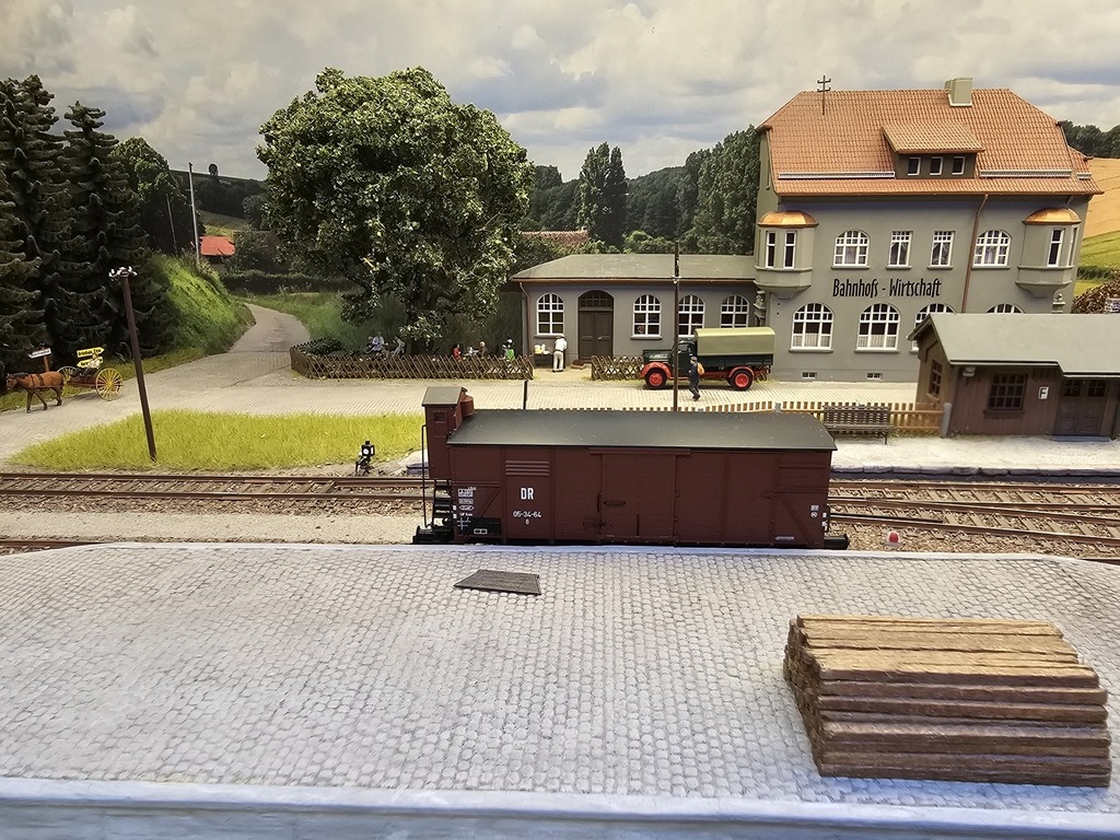Dieser G-Wagen hat sein Ziel ebenfalls in Grünhain-Bernsdorf erreicht. An der Ladestraße wartet er auf seine Beladung. Diese wird aus einem wichtigen Exportgut der kleinen DDR bestehen – typisch erzgebirgischer Volkskunst. Die kleinen Betriebe in der Umgebung haben natürlich keinen Gleisanschluss. Die Nussknacker, Pyramiden und Räuchermännl werden mit dem LKW angeliefert. Der Fahrer der ersten Fuhre hat es aber offenbar nicht eilig. Er parkt vor der Bahnhofswirtschaft und nimmt wohl ein Mittagessen ein.