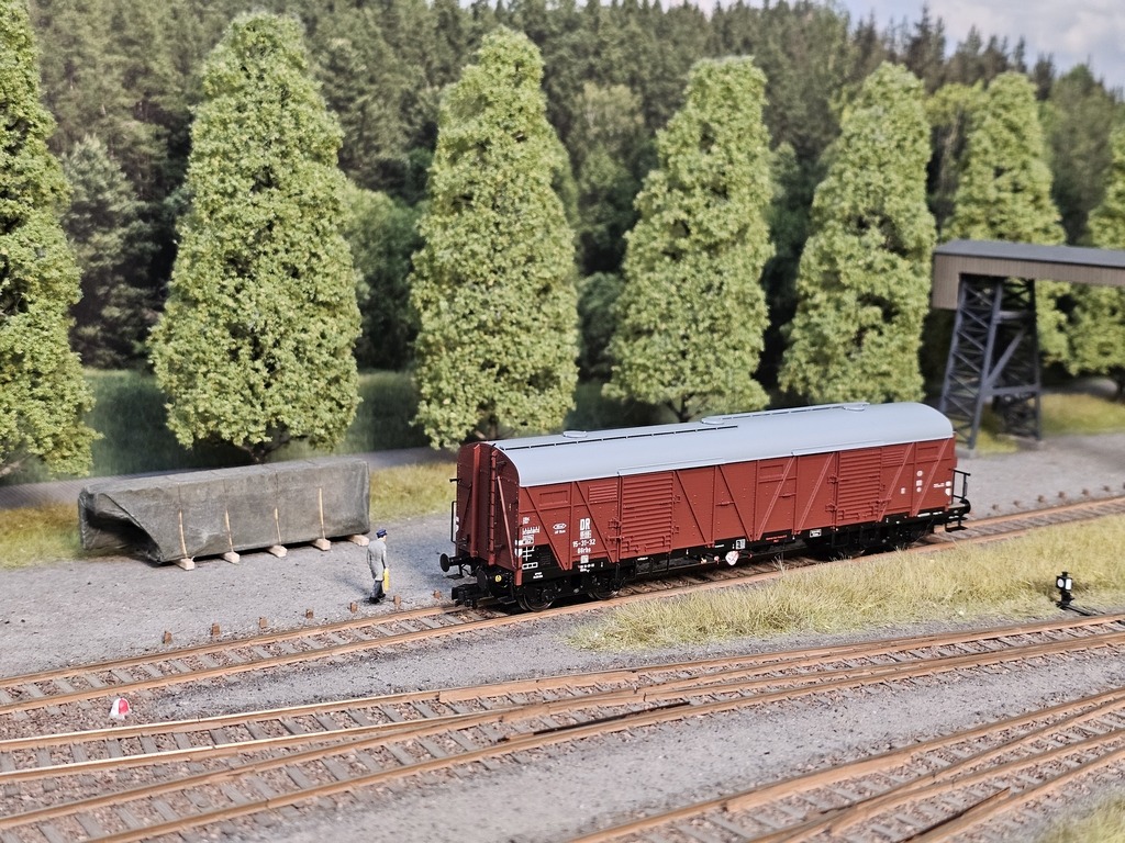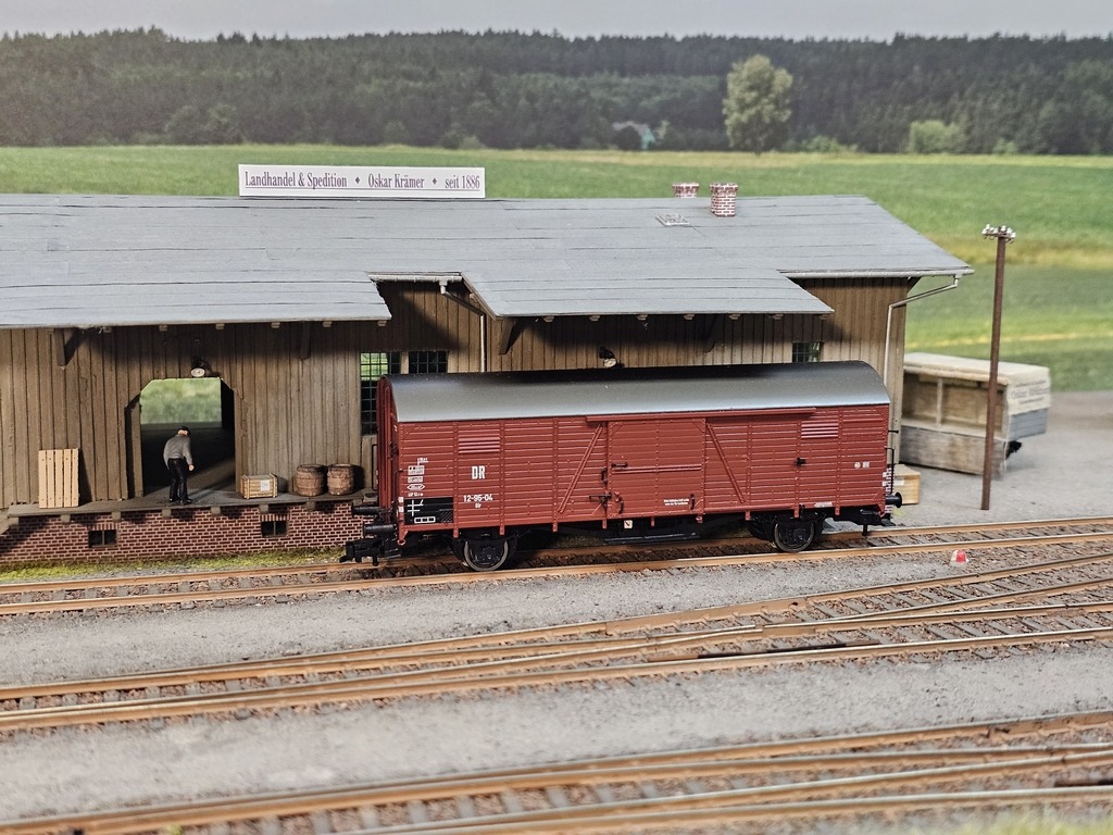Dieser Wagen der Gattung Glr wurde an den Landhandel Krämer rangiert. Er ist mit allem beladen, was so ein Landhandel verkauft. Dies sind u.a. Werkzeuge, Kleingeräte, Eisenwaren, Baustoffe, Saatgut, Düngemittel, Futtermittel usw..