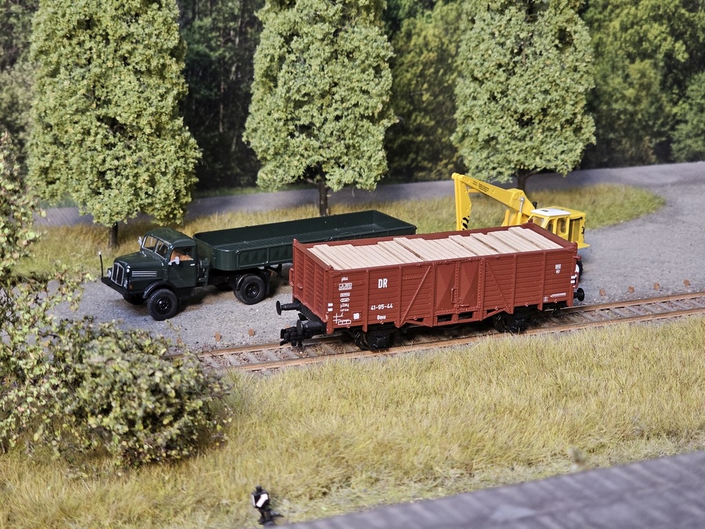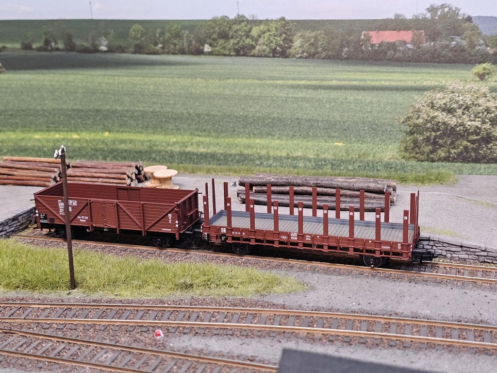 Diese beiden Wagen sind die letzten aus dem Zugverband. Sie werden mit einem weiteren Massengut beladen – Holz. Wobei der Ommr die kürzeren Hölzer aufnehmen wird und Rr die Baumstämme.