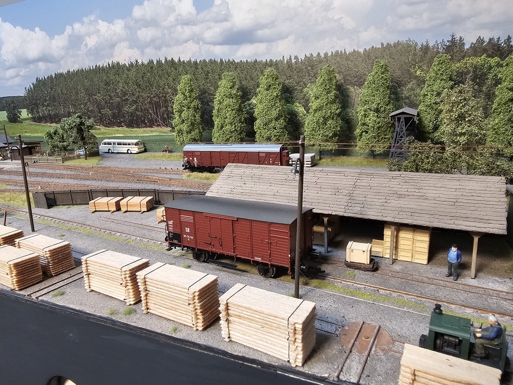 Auch der nächste Wagen im Zug ist ein G-Wagen. Dieser ist der erste Wagen der in Kleinhartmannsdorf zugestellt wurde. Er steht nun auf dem Anschlussgleis der Kistenfabrik Hofmann und soll mit fertigen Kisten beladen werden. Der Vorrat an geschnittenem Holz ist wohl noch ausreichend.